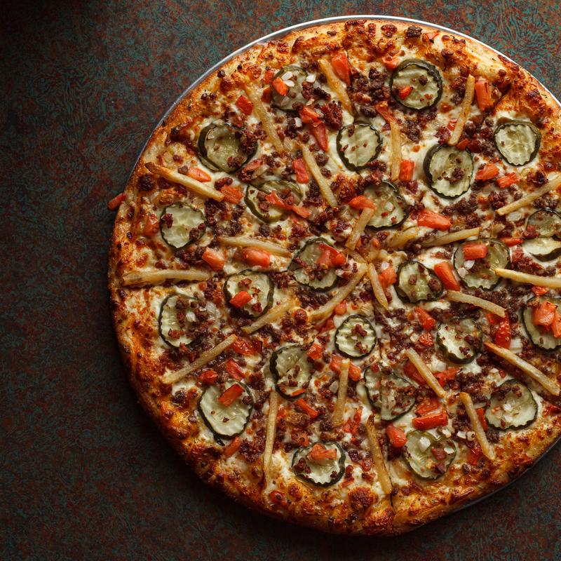 Beef, tomatoes, pickles, onions, ketchup & mustard base, bacon, topped with fries • 10'' $16.00 | 14'' $22.00 | 18'' $27.00